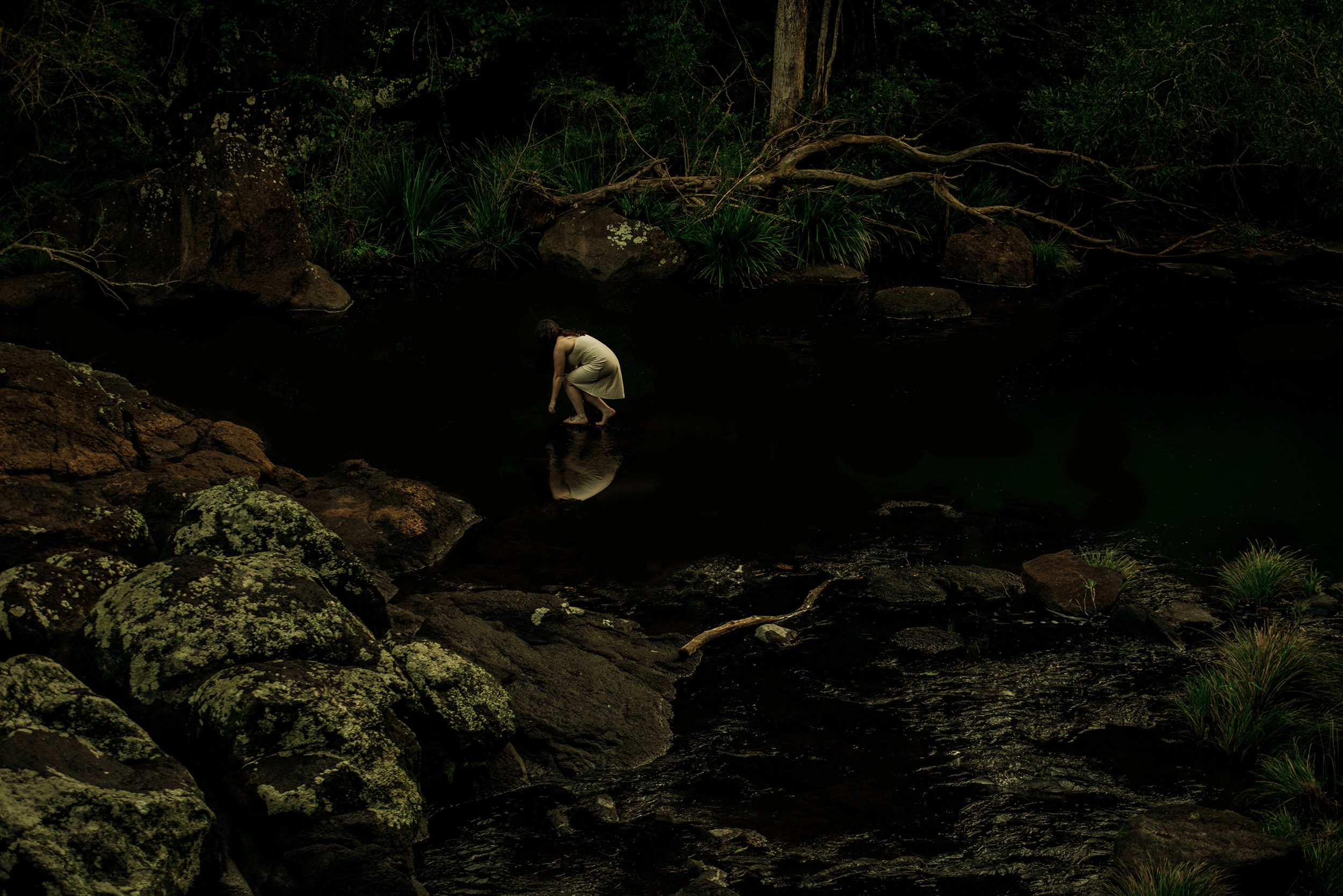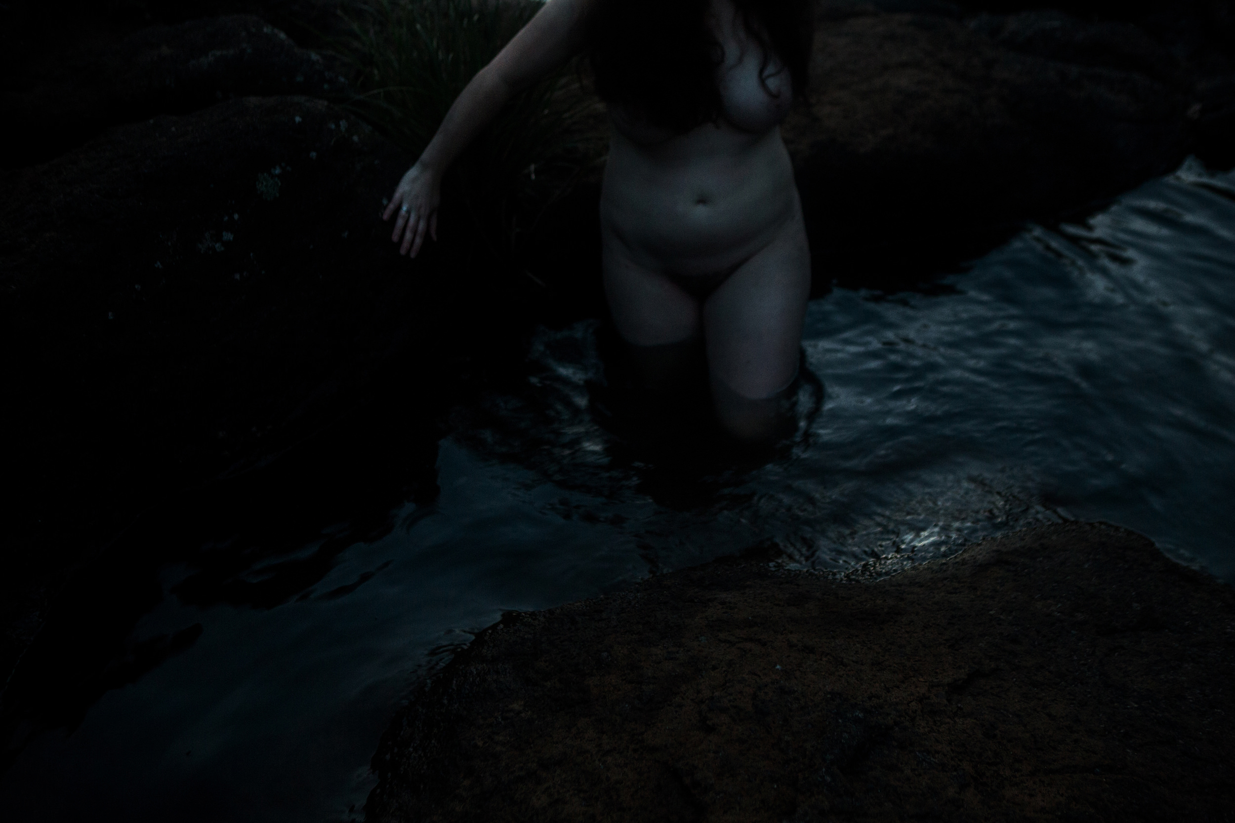 Set against wild, often darkened environments—rivers, rocks, and dense bush—the figures are at once vulnerable and powerful. They are not separate from nature but part of it, absorbed into the textures, shadows, and rhythms of the land. Through this visual intimacy, the work becomes a meditation on self-acceptance, environmental kinship, and the reclamation of the body as a site of belonging.